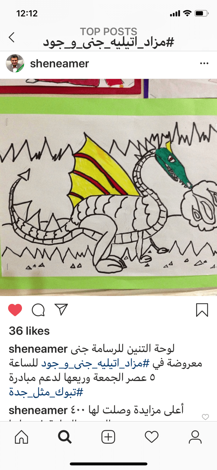 رأيت لوحات بناتي تزين جدران صالتنا وغرفة ابنتي جنى وجود – عمر الكبرى وقتها ١٠ سنوات وجود ٧ سنوات – فعرضت فكرة تبرعهما بهذه اللوحات لعمل مزاد عليها يذهب ريعه لإغاثة المتضررين في تبوك ففرحتا بذلك كثيراً وقمت بتنظيم مزاد تحت هاشتاق #مزاد_اتيليه_جنى_و_جود في وسائل التواصل الاجتماعي وتم عرض الرسمات تحت نفس الهاشتاق في انستجرام – ومازالت هناك. كانت للغالبية “شخاميط” أطفال ولكنها للبنات ولوالديهما لوحات عظيمة قام بالمزايدة عليها عظماء من مجتمعنا النبيل وبيعت اللوحات بمبلغ تجاوز ١٠ ألف ريال حيث تراوحت الأسعار بين ٤٠٠-٢٠٠٠ ريال للوحة. هذا الكرم العظيم من هؤلاء العظماء الثمانية أفرح ابنتيّ بشكل لا يتصوره أحد. واليوم أتذكرهم بكلمة شكر وهم د. عصام مرشد (قام بشراء لوحة التنين)، د. هيثم طيب (لوحة القلعة)، د. معن قطان (لوحة جني في قارورة)، خالد أبو ذياب (لوحة التفاحة)، عبدالرحمن الغامدي (لوحة ليش أخذتي بستي)، معاذ خليفاوي (لوحة الملكة)، عبدالرحمن مظهر (لوحة روبونزل نجد و لوحة الجندي)، هشام الخريجي (لوحة المهرج).