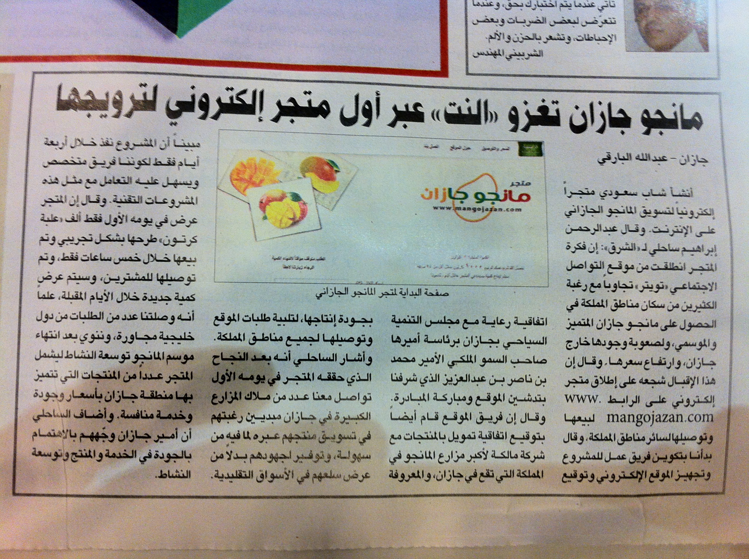 حل الموسم وانتشرت رائحة مانجو جازان المميزة في المزارع المتناثرة في الريان وأبي عريش وبيش وأعلن عبدالرحمن انطلاق الموقع ودشنه بحملة تسويقية باستخدام الشبكات الاجتماعية وخاصة تويتر وسرعان ما انتقل الخبر للصحف الإلكترونية منها والتقليدية لتكتب عن هذه التجربة الاحترافية المتميزة وكانت صحيفة الاقتصادية هي أول من كتب في موضوعين متلاحقين الأول بعنوان (مانجو جازان متاح إلكترونيا) ثم تلته بموضوع (شاب يسوق مانجو جازان إلكترونيا) ثم تلتها صحف عدة منها صحيفة سبق الإلكترونية بموضوع (مانجو جازان، أول مشروع من تغريدة) وبعدها انتشر خبره في كل مكان فكتب عنه العزيز خالد الناصر في صحيفة اليوم (مذاق أهل جازان) ومجرد البحث عن كلمة مانجو جازان في جوجل سوف تجد مقدار انتشار خبره!